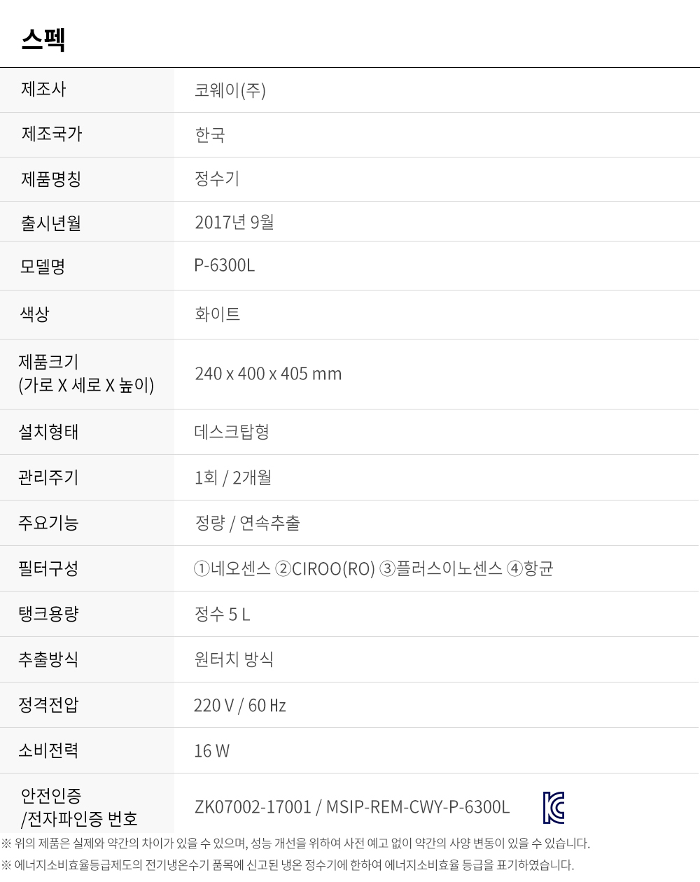• [코웨이] 일반정수기 P-6300L P-6300L