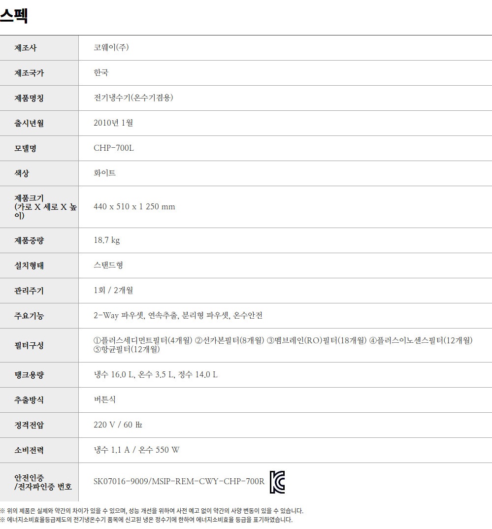 • [코웨이] 대용량 냉온정수기 CHP-700L