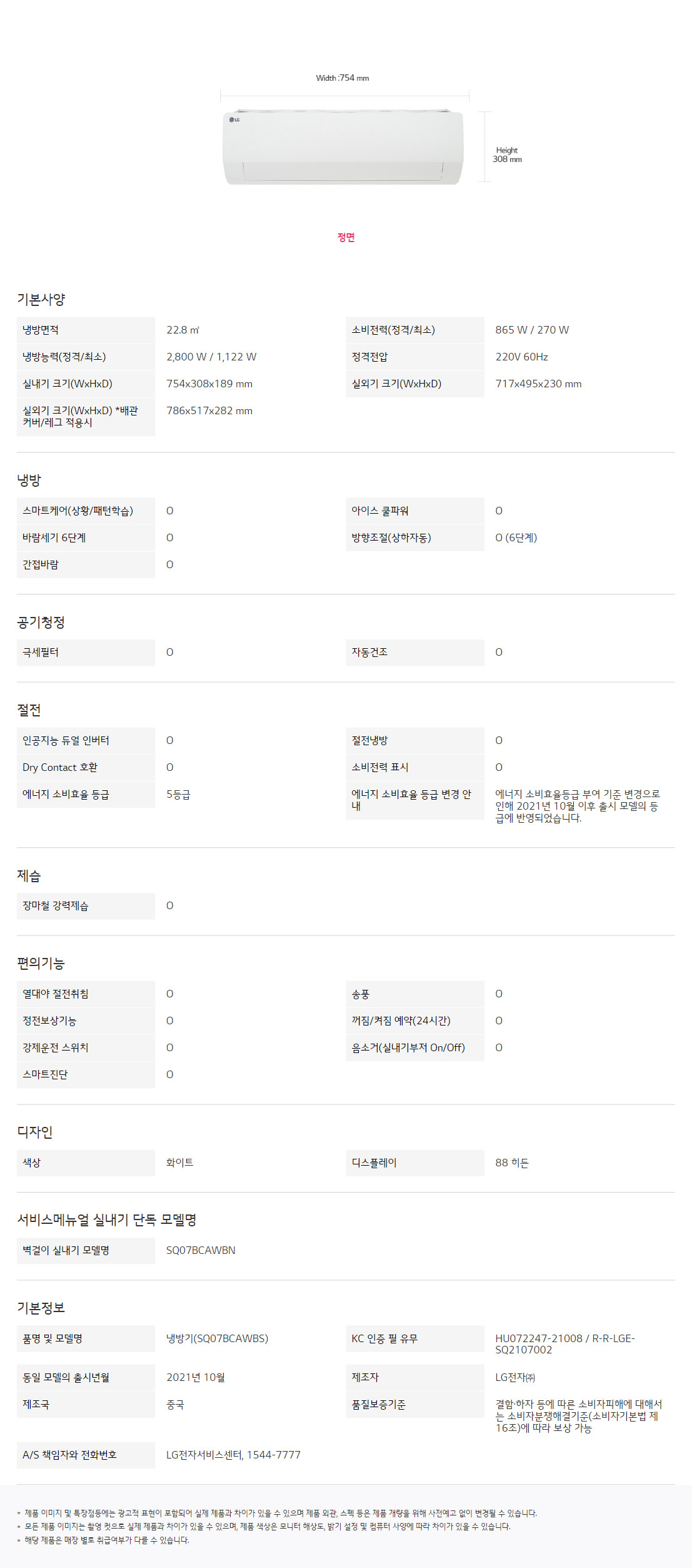 • [LG전자] 벽걸이 에어컨 7평형 화이트 SQ07BCAWBS