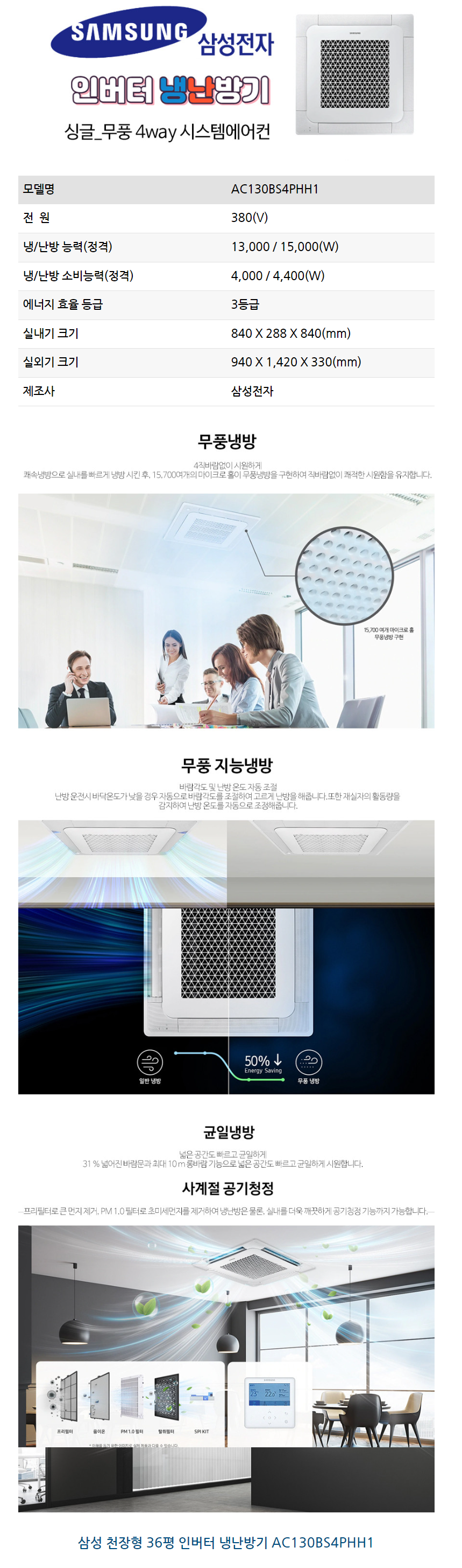 • [삼성] 프리미엄 무풍 4WAY 천장형 시스템 냉난방 에어컨 36평형 삼상 380V AC130BS4PHH7SY